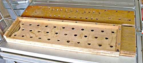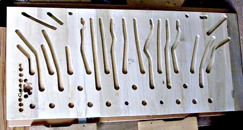 I needed two layers of these routed channels, so the layers of pine were separated by a layer of thin ply, with the whole thing sandwiched between two more layers of ply. Not now a "chest", it became a distribution board as it directly distributed the pipe wind from the keyframe relay to the pipes.