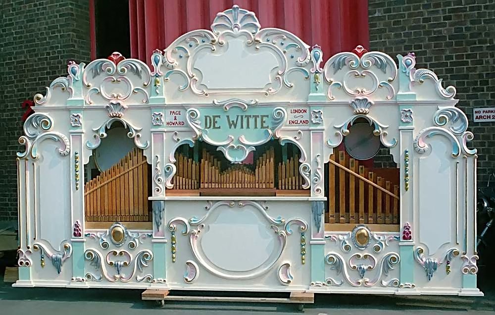 In 2017 I caught up with De Witte at a rally on the shores of Lake Ontario at Olcott Beach. The present custodian is John Ravert, who has added two extra ranks of bass pipes as fitting the organ into a trailer restricted the original bass sound. He has also added an impressive array of percussion, utilising some of the unused keys. (These are still indicated as "not used" in the registers list.) He has also added a MIDI player to the organ, which allows him not only to play files supplied online, but can select music to play remotely while lounging several metres away. I hasten to add that it can still be played from the original keyframe, but not now hand-turned because of the need for more wind.