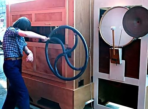 The first set of pictures is of the first of these organs to be built, shown above with Judith Howard hand-turning. (the sound recording at the top of this page was turned by myself. Details of the second 90-key organ.