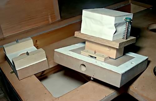 Above left: After abandoning my use of the Mortier type of keyframe, this organ has the more straightforward Limonaire design. It has only two touchboxes instead of three. The picture shows them from the bottom, with the exhaust valves mounted at 7mm pitch. Above right: the register box, just like the other one, shown with the top cover removed.