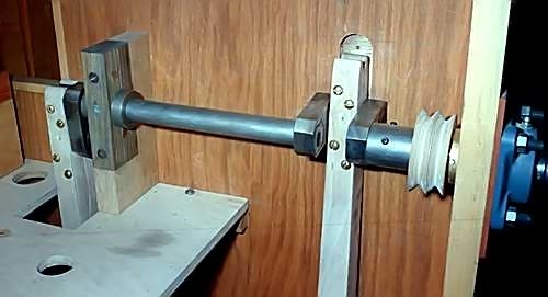Once the main chest had been installed into the case, the bellows crank was set-up. The bellows and turning wheel were from a Mortier owned by the late Brian Oram. Brian had installed a blower system and the bellows became redundant. The Mortier crank was used at first, but my customer wanted more wind, so another crank with increased throw was made. He asked for the wheel to be fitted by a screw action to prevent reverse turning which would damage music. You can see the screw thread on the right (above left). The small crank, for a 52-key organ being built at the same time, is shown for comparison). Above right: The crank installed into the 90-key case, together with the two connecting rods and double keyframe pulley.