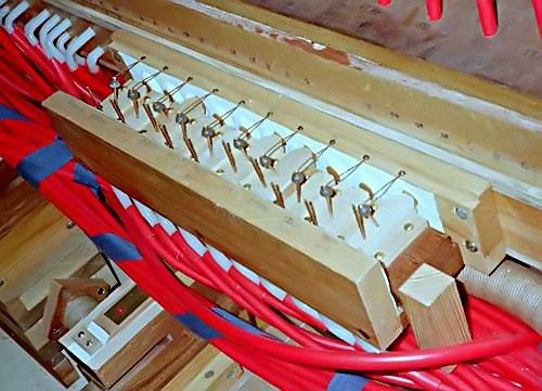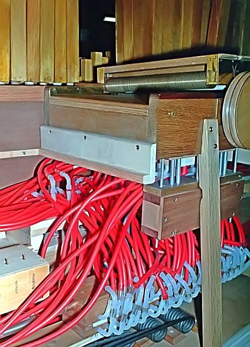 Key frame design is based on the successful Mortier system with three touch-boxes and valves spaced at 10.5mm. Above left: Exhaust valves actuated by push-rods beneath the keys. Above right: The three touch-boxes installed in the frame.