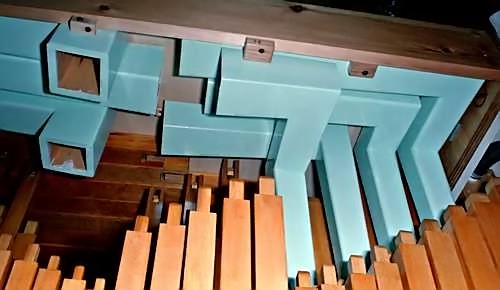 Below is shown the main chest. The centre section is a conventional "bar" chest, with channels for the melody pipes and its registers. Unit chests are mounted over the three rows of holes, each operating a register: two ranks of bourdon in front (at the top of the picture), two ranks of violin in the centre, and two ranks of violin celeste at the back. Register control is by membrane action, operating in reverse, i.e. charged for "off" and exhaust for "on". The piccolo action is entirely separate. Either side of this section are holes for wind supply to the accompaniment chests and counter-melody bifoon (pronounced "bee-phone") and trombone.