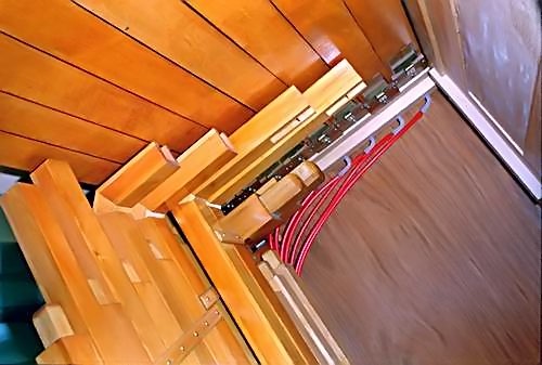 Above left: The trombones are seriously mitred in the roof of the case to accommodate their length. Behind them can just be seen the bass cellos mounted horizontally in the roof, also shown in the picture (above right). Below them are the mitred accompaniment basses.