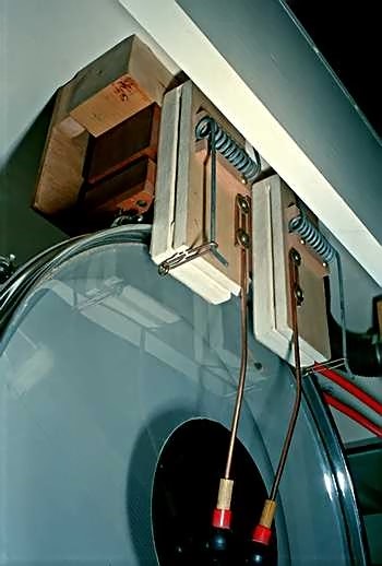 Above left: An innovation for register control was incorporated into these organs. Ventil units were fitted into the main chest from below, which can be readily removed for maintenance without disturbing any pipes. Above right: Both "charge" and "exhaust" versions of this unit are used, allowing a simple means for providing the counter-melody tremulant, which acts upon the pipe wind, and not the note action as with the melody tremulant.