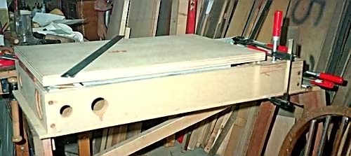 Above left: The plinth section of the case, shown upside down. It houses the 16-foot bass pipes, and connected to them, the quints. It's worth mentioning here that the term "16-foot" is relative. Normal pitch for melody is 8-foot (the length of the largest pipe in a church organ at normal "piano" pitch). The normal pitch of bass pipes is 16-foot. In a church organ a 16-foot bourdon pipe is "C", 8 feet long (stopped); the lowest note here, nominal "G", transposed up three notes, is approximately 4½ feet long. Above right: the reservoir - ribbing in position ready for leathering.