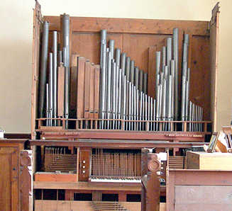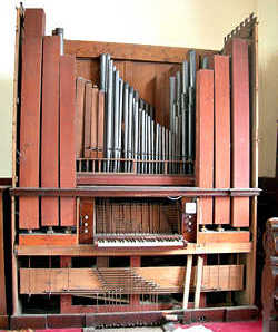 Six of the pedal bourdon pipes are seen here - three on each side. There was no room for the seventh one there, so it had been mounted horizontally deep within the organ.