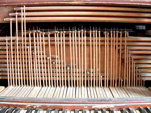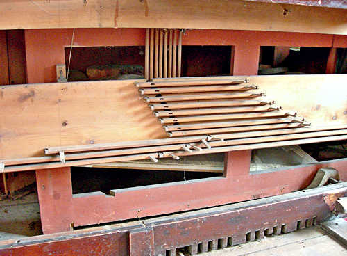 Above left: The action "stickers” - stickers push, and trackers pull. When a key, pivoted in the centre, is pressed the back rises, lifting the sticker rod causing a roller on the roller-board above to turn, transferring the key's movement to a backfall which, in turn, pulls down a tracker at the back of the organ to open a pallet, letting wind to pass to the appropriate pipes. Note the rather odd layout, with almost random notes going to the left side, and all others in consecutive order, apart from a few basses running to the right via the small roller-board at the top. Above right: The pedal roller-board, after the trackers had been removed. Six of the pedals actuate the big wood pipes at the front of the organ, and eight actuate the bottom of the manual keyboard via the stickers still in place behind the roller-board. One pedal pipe is positioned at the rear of the organ, lying horizontally. It has its own action, shown later.