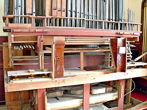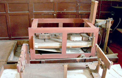 Note the house-bricks used to provide the correct wind pressure, on the reservoir top. These are replacements for cast-iron weights which would have been used originally. It’s a pity they were not still there, as initials engraved on them may have indicated the organ’s original manufacturer.