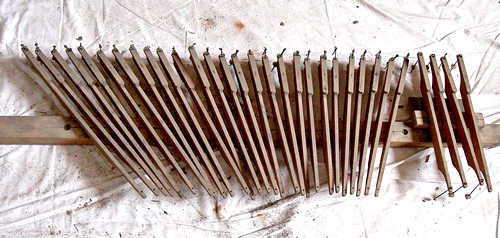 Here (right), the front action has been removed. The two 3-note pedal chests have been opened up, but stubborn screws prevented their removal. I decided to take them out still attached to the stop-jambs, and work on the assemblies at home. Showing in the picture are the front ends of the horizontal “backfalls” – horizontal levers transferring the key action from the front to the back of the organ, where they connect to the chest action “trackers”. They are pushed upwards at the front and, being pivoted in the centre, the rear ends pull the chest action downwards. (Stickers push and trackers pull.) The centre backfall assembly is shown below left.