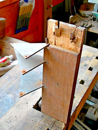 The pictures above show the stop action on the right hand side. It operates the three sliders at the rear of the organ. The three triangular metal plates are cranks which transfer the in-line movement of the stop knobs to a transverse movement to reach the long trundles operating the sliders. The crank supports which were seriously damaged on removal needed to be completely re-made. I modified the crank pivot arrangement to make it easier for replacement in future. The steel pivot pins were replaced by phosphor-bronze. The Open Diapason stop knob was replaced by a new one, and all the other knobs were treated to a waxing to enhance their engravings. The top end of the F# bass pipe just shows on the right.