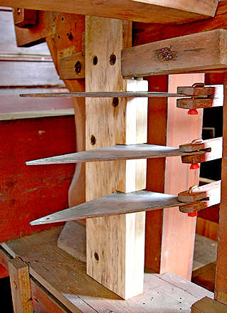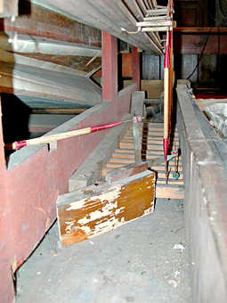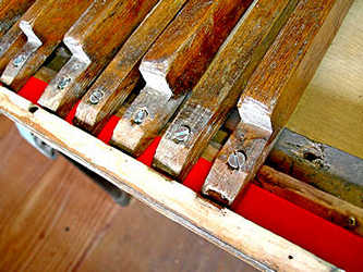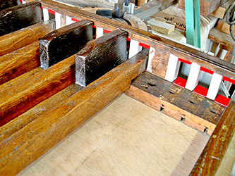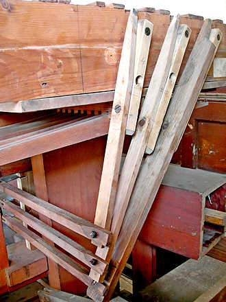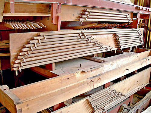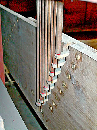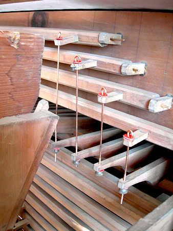 Work then began to restore the roller-boards (above). These are specially made for this particular instrument, used for transferring the vertical movement of the keys to a different place horizontally within the organ. There is a set for the manual action, and a set for the pedal action. They were completely dismantled, blocks re-set or replaced, and the pivot pins were either cleaned and coated with Kurust (leaves a rust-proof zinc coating) if they could not be removed, or replaced by phosphor-bronze pins if they were heavily rusted.