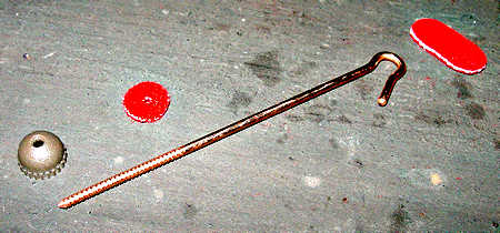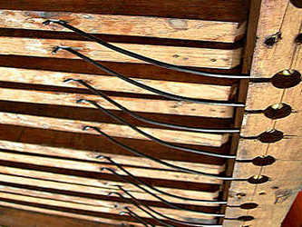The items on the right are the staple parts of mechanical action. The threaded wire is phosphor-bronze, and is made from straight lengths. The one here was made up in the workshop for the main chest pull-down. The button is plastic, half the price and longer lasting than leather buttons which rot over time, especially in damp conditions as was experienced in this building. The oval felt pad was custom-stamped in the workshop for a cushion between metal hooks, all of which are shown in the picture (below left).