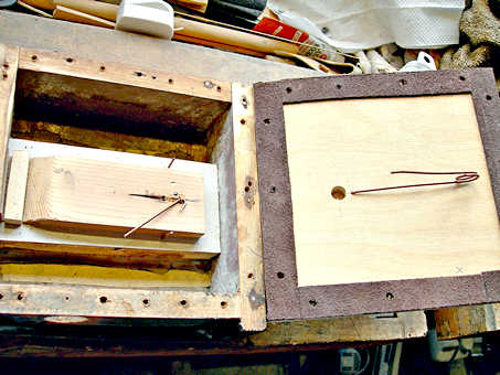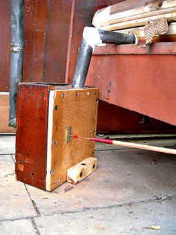 The only action part to be done now was for the F# pedal pipe mounted in the back of the organ, lying horizontally. This was a single-pallet box (below left) connected from the reservoir by a short lead tube, actuated by crank and tracker from the pedalboard (below centre and right). The cover plate was seriously damaged on removal, so it was re-made. The pallet was re-covered with felt and leather, and new guide pins and spring were made from phosphor-bronze. The same treatment was given to the two main bass chests, one of which also needed a new bottom board.