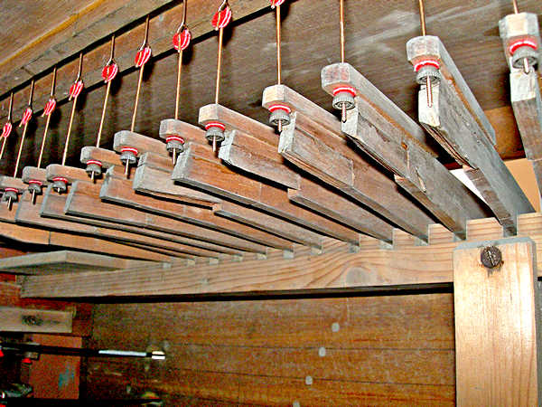 Below centre: These four actions are transferred to the right of the chest from the left side of the keyboard. Some low notes are placed on the right to help balance weight distribution. Below right: the eight upper pedal notes which get their sound from the lowest eight notes on the manual keyboard. These stickers push up under the backs of the keys. This kind of action is called “pedal pull-downs”, as they appear to pull the keys down.