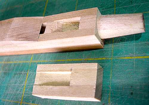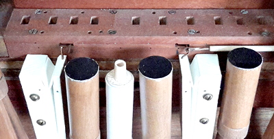 Making the other pieces presented no problems, and so the pipe was made, and voiced to match the others. I then took out the forte pipes and their mounting block from the organ, together with two of the existing trumpets and the two register pneumatic motors. Measuring the space and doing a spot of carving I was almost ready to fit everything back in, see the picture which shows the pipe in position before the boot was covered to match the others.