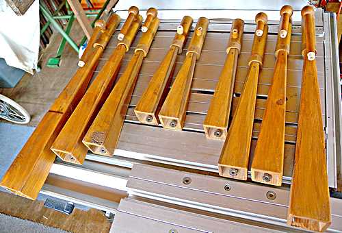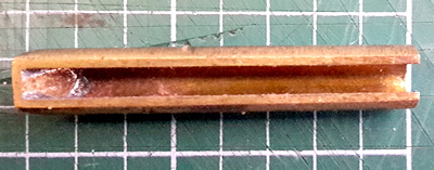 I made some measurements and worked out that if two of the existing reeds were moved out of the way, the extra pipe would fit snugly. So, work began. Making another pipe would not be a problem, but the original shallots had been made by a specialist company, and an order of only one would be prohibitively expensive. So I made made it myself. I had plenty of brass sheet, and found some 16swg (1.5mm), and cut two pieces - one for the tube and one for the tip. With a suitable dowel I hammered the tube into shape, with an approximate opening down the length. Then, after grinding one end to a 45 degree angle, I silver-soldered the tip into position. After cleaning up the shallot and grinding the flat so the opening was the right size it was ready, see the picture.