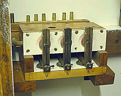 Register changes are activated by holes in strategic positions on the music card. The impulses created need to be remembered to keep the required registers operating. The "memory" for this is the Register Box. The VB scale has provision for four registers, but for some unknown reason this particular organ has only three. The register box, therefore, has three latches which hold the registers on. The registers are all cancelled together by physically pushing the latches out.