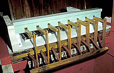 While the baritone case was being decorated I worked on the glockenspiel units. The actions had been taken apart and cleaned out. The steel bars had already been freshly chromium plated. The main motors are unique to Marenghi organs in that their valve action is contained internally, like bass-drum motors, but in miniature. These needed complete dis-assembly. The valves were re-leathered, the springs were renewed, and the assemblies re-built. The motors themselves were re-leathered with the inclusion of new card ribbing.