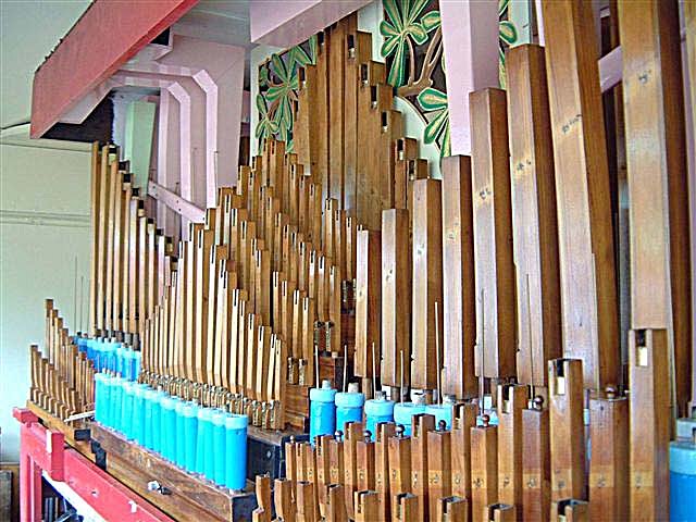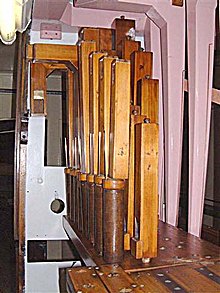 Finally, the saxophone reeds were installed. This was the first gilded rank to be fitted, and extreme care was taken to avoid touching their fronts. I had decided to paint their stays red, as had been done prior to my involvement in the early 1980s. I had a photograph showing red stays on the saxophone, clarinet and baritone pipes.