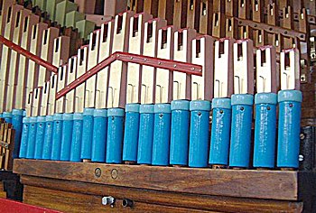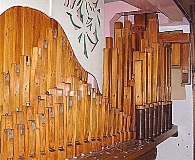 In the middle of July 2005 I travelled to London to collect the pipes from Judith, and installed the remaining accompaniments. Of course, as with all flue pipes from Judith, I had to tension the tuning slides. Judith always leaves them flat, relying on their width to keep them tight in their slots. Unfortunately, changes in humidity render this approach disastrous. In dry weather the slots pull in, compressing the timber, so in damper weather the slides have room to move, and move they do - very easily. However, eventually, the basses and accompaniments were ready for testing. Note by note they were tuned and found to be speaking well. The box reeds, fitted with slides, needed to be carefully regulated for a good sound, by moving the slides to their optimum positions. The clarinet mixture, minus the reeds, is shown here in position, but not stayed yet.