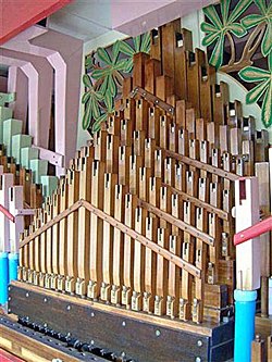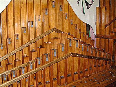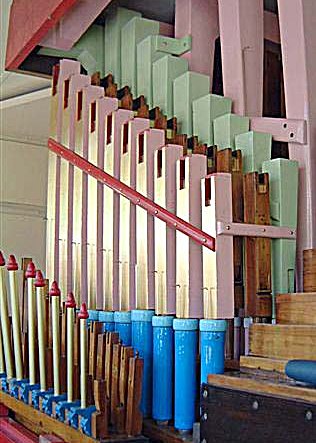 Following the clarinets came the piccolos, mounted on their risers on each side. The two ranks at the back are positioned alternately: open harmonic/stopped, and stayed in a row. In front of these are the brass pan-flutes, stayed by two beech strips one behind and one in front of the pipes, screwed together. Between these are the small open pipes, not stayed, but anchored at their feet.