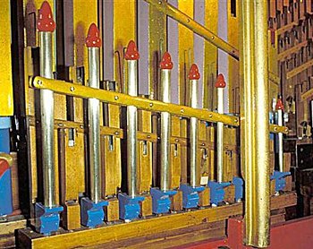 Now all pipes on the main part of the organ were finally fitted. Only the baritones remained. These were mounted temporarily onto their chest which had been positioned on plastic crates in front of the organ. The chest had previously been tested for action, but not tubed up. For testing the pipes, tuning and setting the reeds' regulating slides I worked the actions from the levers beneath the chest. I hung a small weight on the levers so I had both hands free for the task. Once I was happy I removed the pipes once again and fitted the action tubing between the puff rail beneath the chest and the quick-release blocks on the front of the main organ.