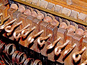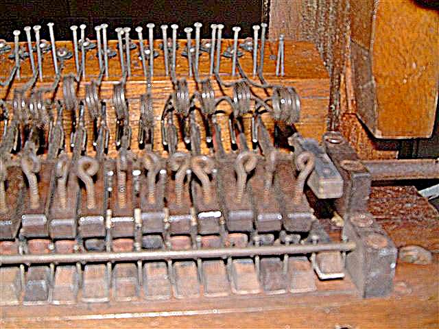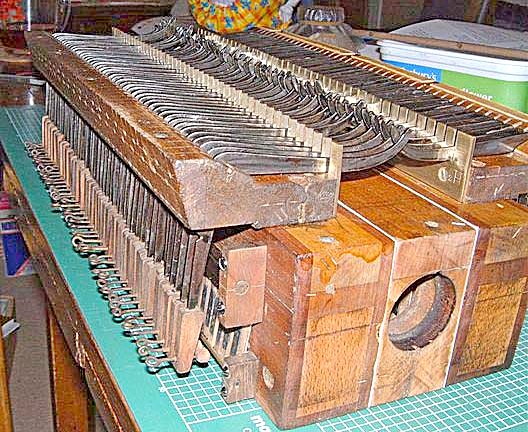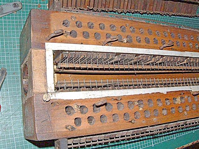 Upon re-assembly in the outer frame, all parts were then adjusted to work correctly and the levers tweaked to ensure them running in their guides without tightness, and to make sure the keys sat on top - they are prone to slipping down the sides and jamming. The little pins serving as guides for the springs had begun to split the mounting blocks, so they were re-positioned; slightly staggered to help prevent the same thing happening again.