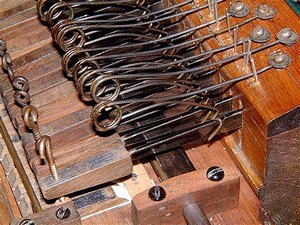 However, all the external "exhaust" pallets are actuated by levers which swing the action from vertical below the keys to horizontal, culminating in adjustable wires and buttons. Beneath these levers are two cam rods, one on each side, which serve to hold the keys in the down position when required, by actuating a handle on the front of the keyframe. This "muting" system needs to be accurately set-up to be out of the way during normal operation, but prevent the internal pallets opening when actuated. This, in conjunction with the other adjustments is very time-consuming. Not wanting to do it twice I decided to fit a new set of keys, so ordered some from Andrew Pilmer, and began to restore the touch-boxes. Re-leathering the pallets, I glued them furry side down, so the smooth side acts as the valve surface. This prevents dust getting caught up in the leather, and provides a more air-tight seal over the very small "land" when closed. Theoretically "wrong", but more reliable. The tiny springs were in very good condition, so I decided to re-use them after re-setting their shape.