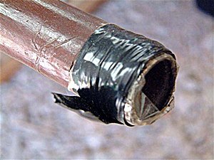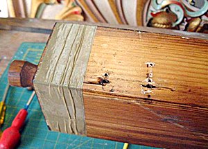 What a mess these pipes were in! The cellos had been fixed using the original wooden blocks, but some had been mutilated with the use of unsuitable screws, not even fitted squarely in the existing holes. Some had parcel tape wound round their tops, to hold them together after splitting. This was removed, and the splits repaired properly. The long pipe feet (to allow speaking room for the bourdons) had been wound round with black tape at their tips, presumably to ensure a good airtight fit, which hadn't worked. This was all a far cry from how we had left it in 1983.