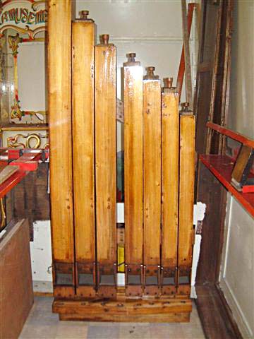 Once the chest and pipes had been completed, it was time for testing. The whole assembly was mounted in an upright position inside the lorry, and the blower connected, via the overhauled reservoir. The picture shows the first seven pipes in position. When switching on the supply, the motor ran for a few seconds before dying. The power supply had fused. The yard was supplied by 3-phase, but fuses were not accessible to me. The yard's owner needed to fix it, but that wasn't done for a few weeks, so the testing process had to be put on a back-burner, and work continued at home on smaller parts.