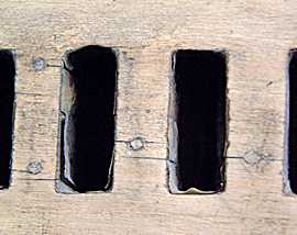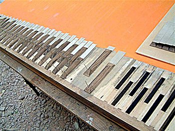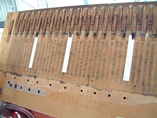 This is a conventional bar-chest containing 94 channels, three of them large ones for register ventils. There were splits in the table (the chest's top board) So I pegged them where they crossed the bars beneath to prevent wind running from one note to another, and the splits themselves were filled with a sawdust compound. With the pallet-box and calico removed I could see that glue meant for sealing it had shrunk and lifted in spectacular fashion. Also, five repaired splits ( done in situ a few years ago - keyhole surgery) became clearly visible.
