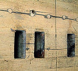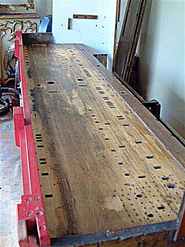 The holes left after mounting screws had been removed from the table were found to be rather worn and were very likely to allow the screws to strip the threads when re-assembling the organ. So all these holes were plugged, following which I lightly planed the entire surface of the table, and the bar side of the chest. The table was then treated with shellac, rubbed in "french polishing" style.
