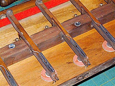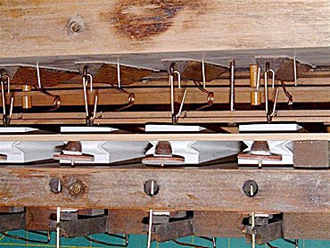 The internal pneumatics were re-leathered, all valves renewed, and all springs re-made in phosphor-bronze. The chests were thoroughly cleaned inside and out and given a coat of shellac. Then they were re-fitted with hardware, and thoroughly tested on the wind, working the levers by hand. However, testing with their primary puff-boards would have to wait until later, when more adjustments would be inevitable.