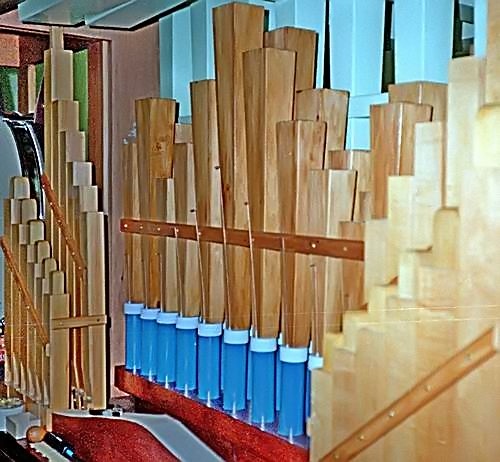 Above right: The accompaniments (one side) installed into the organ, clearly showing the two different style ranks. The cellos were made with "dead-length" tuning, as most Dutch pipes are made. The tuning is far more stable than pipes with movable tuning slides, but more tricky to get right in the first place. I know what an organ owner would prefer!